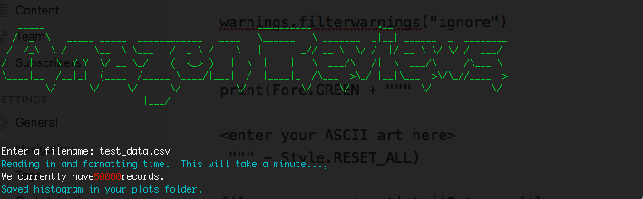 My glorious 1983-WarGames-esque program looks like this. Basically, it allows for my boss to enter a filename, after pointing him to the directory that he asked me to "install" the script in. By typing in: python lowcomments.py into his Command Prompt (it was all on Windows, here I show you on my Mac), all the output automatically shows up. I guess in some cases running an iPython notebook isn't what's needed. Regardless it was pretty fun and here's my code.