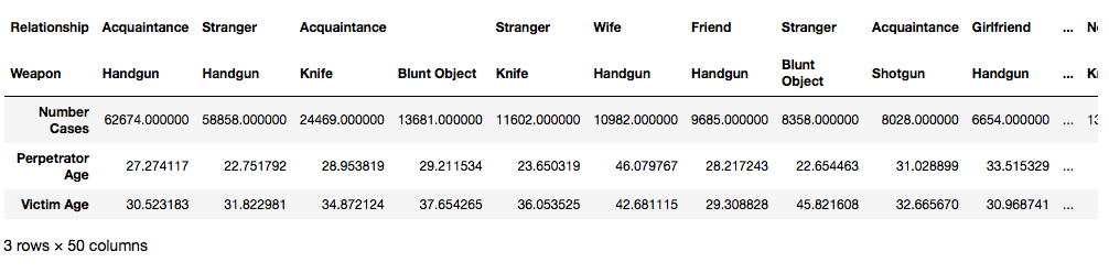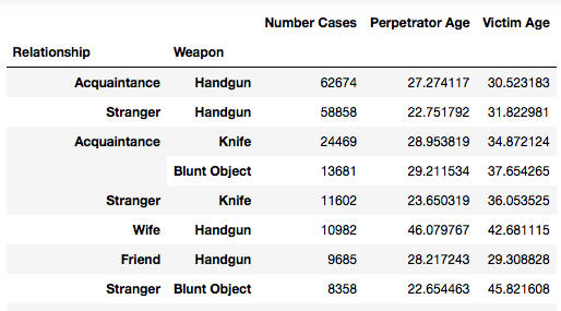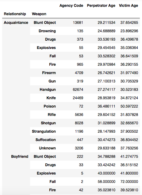 relationships_weapons = pd.pivot_table(known_relationships,index=["Relationship", "Weapon"], values=['Agency Code', 'Perpetrator Age', 'Victim Age'], aggfunc={'Agency Code': lambda x: len(x), 'Perpetrator Age': lambda x: x.mean(),'Victim Age': lambda x: x.mean()})