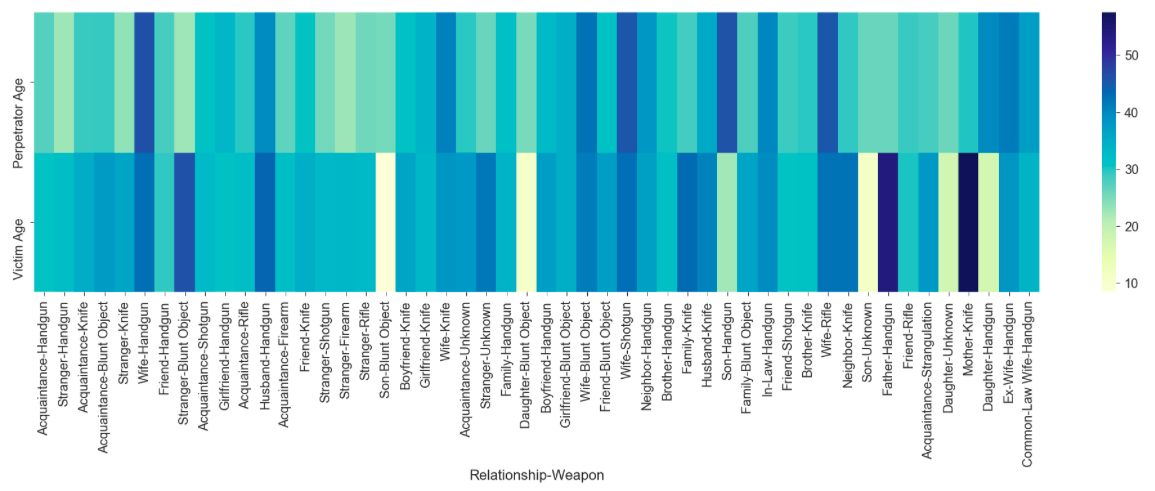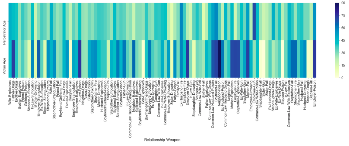 Here, we're only looking at linkages where there are less than 10 cases per link. For example, Wife-Explosives, less than 10 cases of that murderous combination. And it's interesting to see that where in the high-frequency murders of over 1000 cases, the color profile showed a greater equality of the ages - perp and vic were mostly in the blue-turquoise shades, you can see here that there are more dark blues on average age in the victims - indicating a much older victim demographic than perpetrators in these less frequent murders, using more unique weapons and combinations, like: