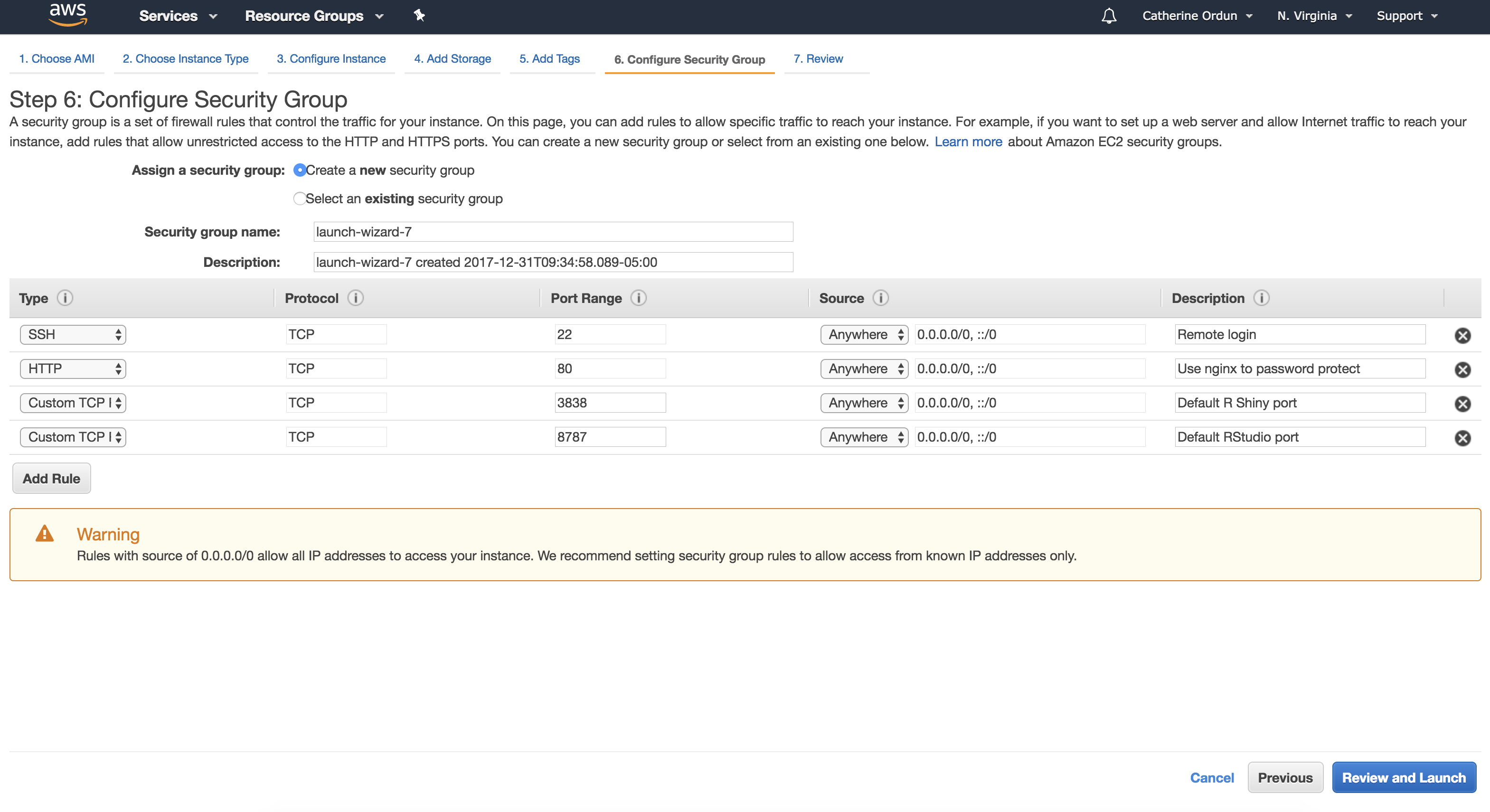 This part is very important, as it allows access by public users to your Shiny App, as well as allows for permitted users to log in to R Studio, by specifying the protocols and ports. Using the configurations recommended by R-Bloggers, here are the 4 security rules: