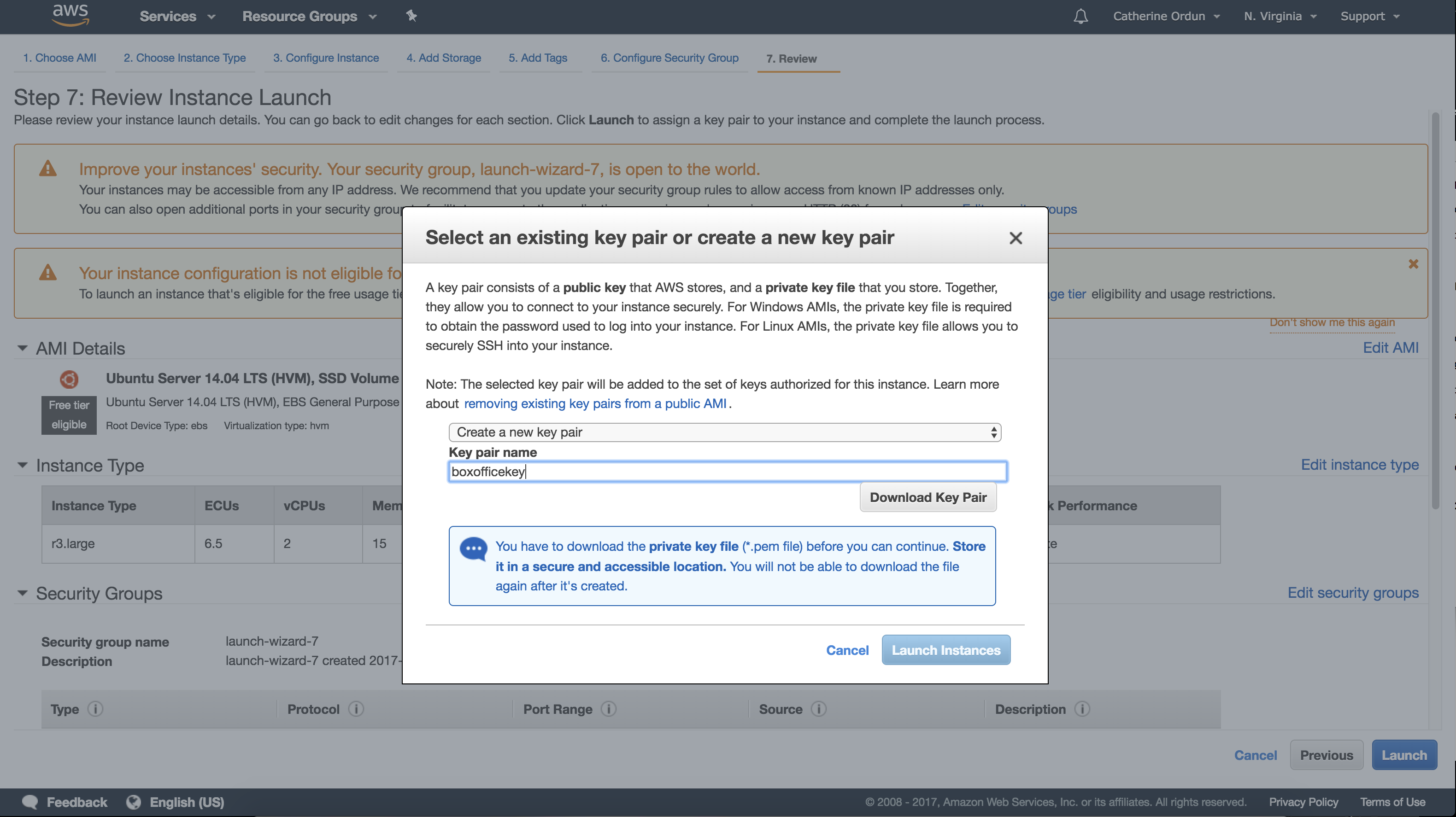 If this is your first time with AWS, you'll be asked to create a new key. The screen will look like the below. Simply enter a name for your key and download it. In this case, I called my key boxofficemojo. Go ahead and click "Download Key Pair" when you're done.