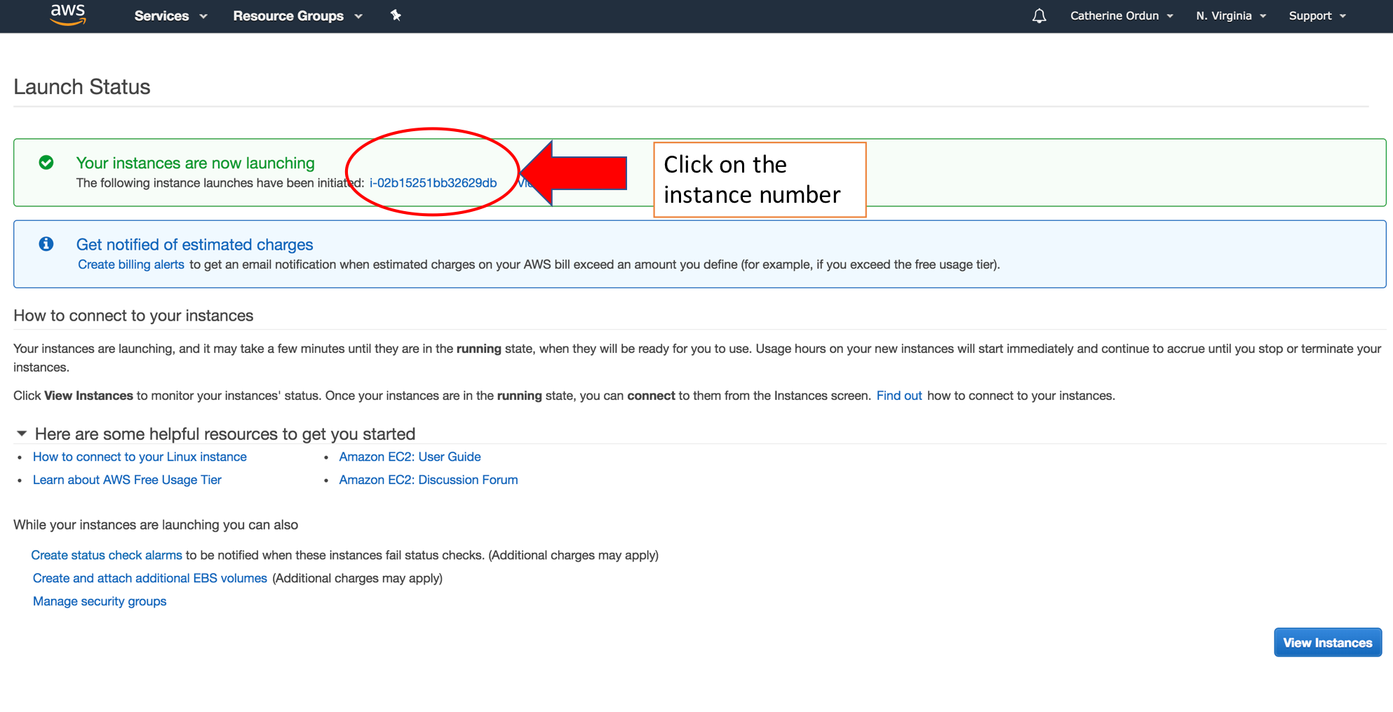Great! If you haven't already, click on "Launch Instances" after downloading your key, and you should see a screen that shows your instance is running: