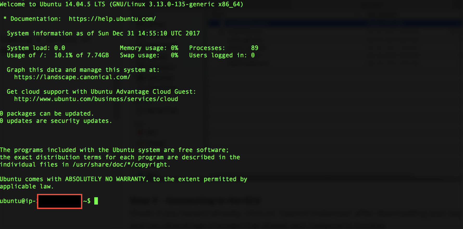 If all's good, your screen should look like this in Terminal, and you're now connected as username ubuntu: