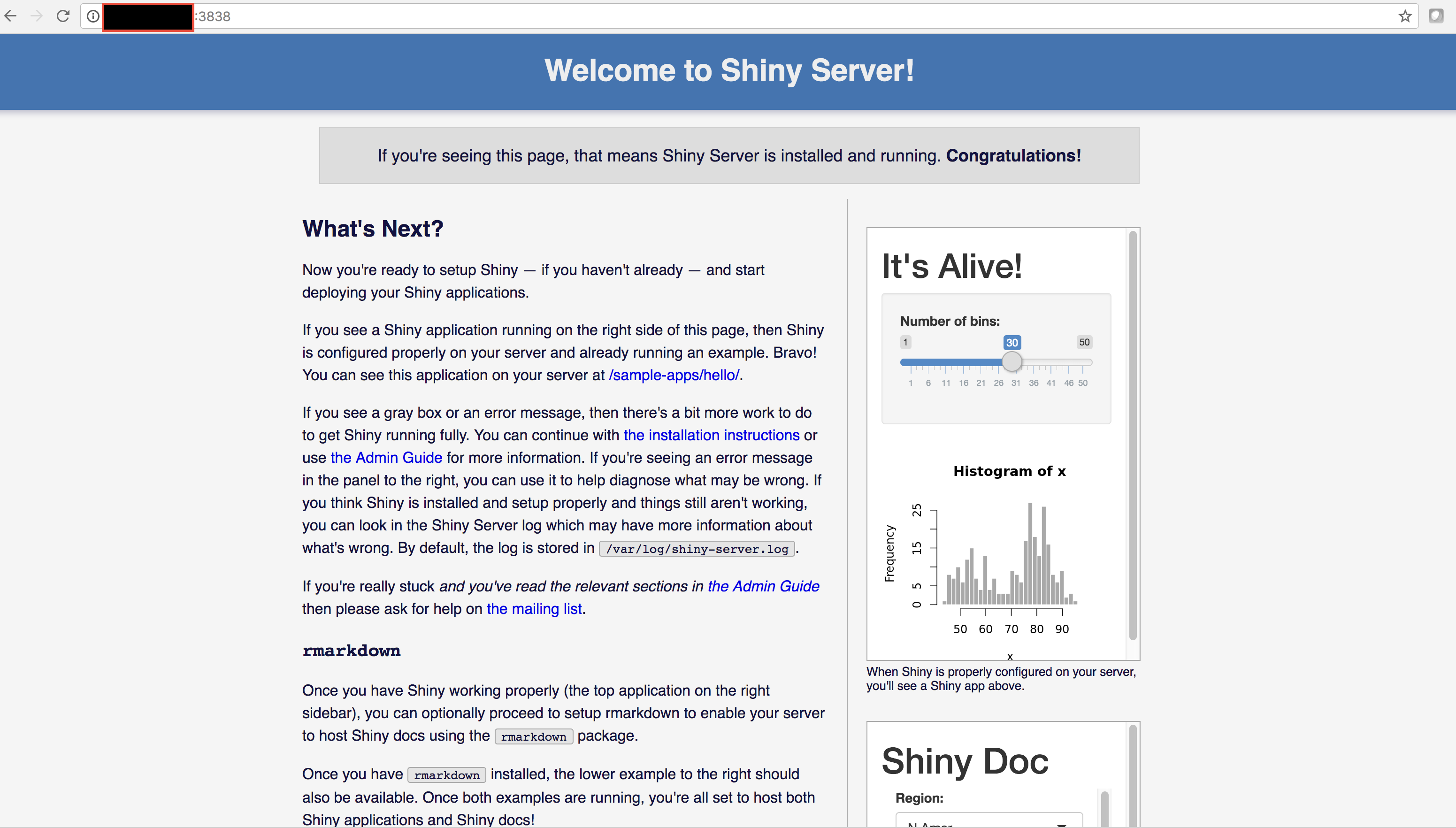 The moment has come. Ok, if you do the same thing like we did for R Studio and navigate your browser to the IPv4 address, but this time with 3838 as the port, you'll successfully see the example sample app: