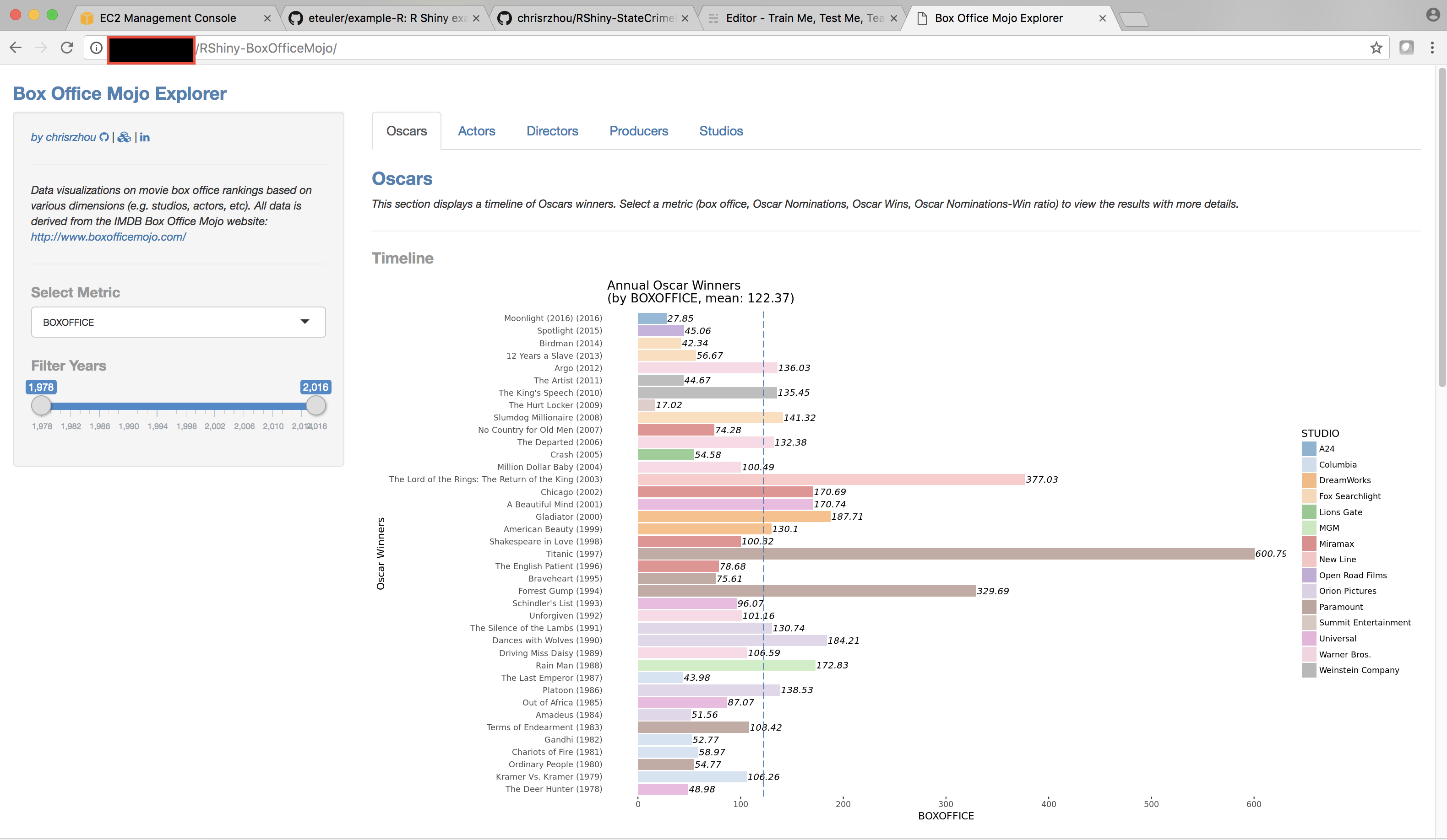 For the walk-through let's deploy this app located publicly online via chriszhou's tutorial: https://github.com/chrisrzhou/RShiny-BoxOfficeMojo. At the end of this post, you'll be able to deploy any R Shiny app to AWS, and it'll look like this: