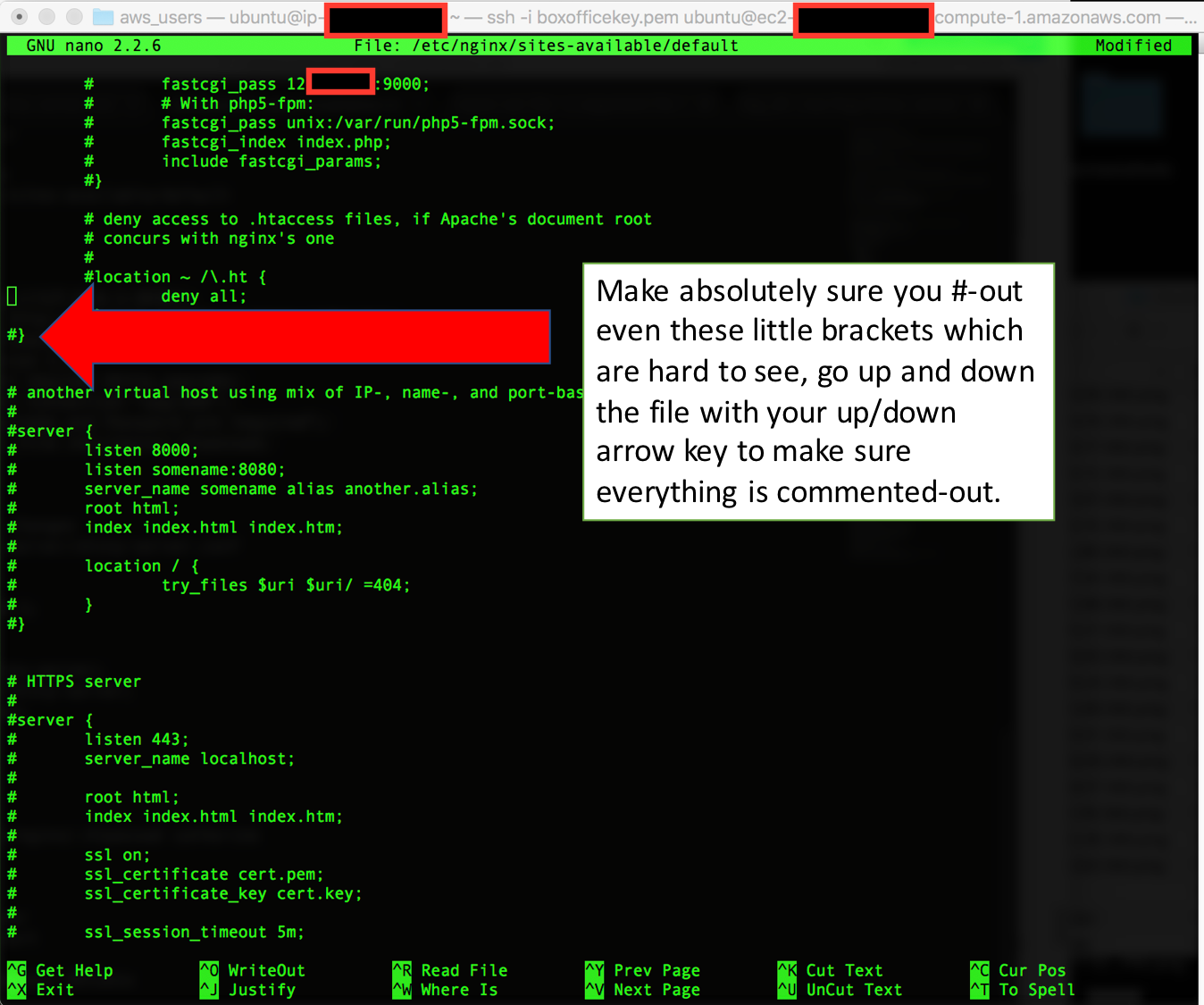 Ok, this is the part I had messed up ALOT. So, be very careful here to ensure you comment-out EVERY. SINGLE. LINE. Except for what I'm about to tell you to edit. Commenting out in nano is in the form of a hashtag, like you'd do in R or Python: #.