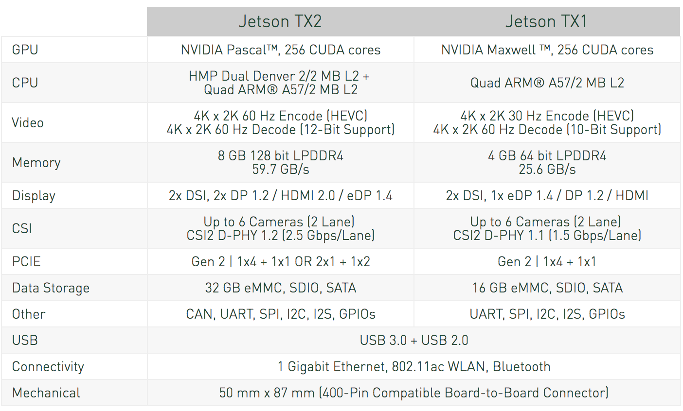 The Jetson, per the NVIDIA website is a: "7.5-watt supercomputer on a module brings true AI computing at the edge. It's built around an NVIDIA Pascal™-family GPU and loaded with 8 GB of memory and 59.7 GB/s of memory bandwidth", and is "ideal for intelligent edge devices like robots, drones, smart cameras, and portable medical devices."