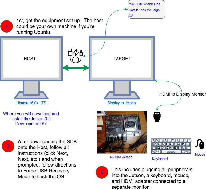 At this point, it's important to note the overall setup requirements before beginning to flash the Jetson. I made the diagram below to describe the set up that I used and that's described in the Jetson Hacks YouTube videos. After you finish flashing the Jetson (aka Target), you no longer need to use the Host and can just use the Jetson since it operates as a small computer (like a Raspberry Pi.