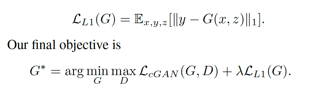 And, uses L1 loss (Mean Absolute Error) as Isola mentioned, since, "using L1 distance rather than L2 as L1 encourages less blurring".