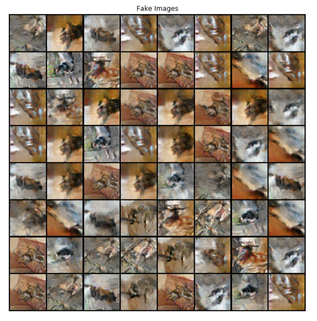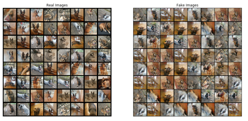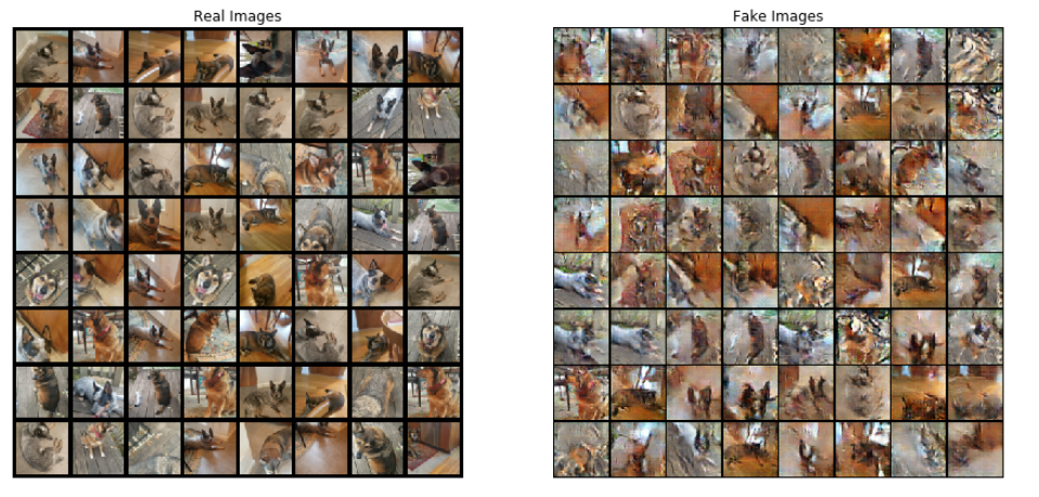 I used the PyTorch DCGAN tutorial right "off the shelf" and didn't change any hyperparameters, loss functions, or architectures. Instead of the celebA faces dataset, I trained against my own dog dataset.