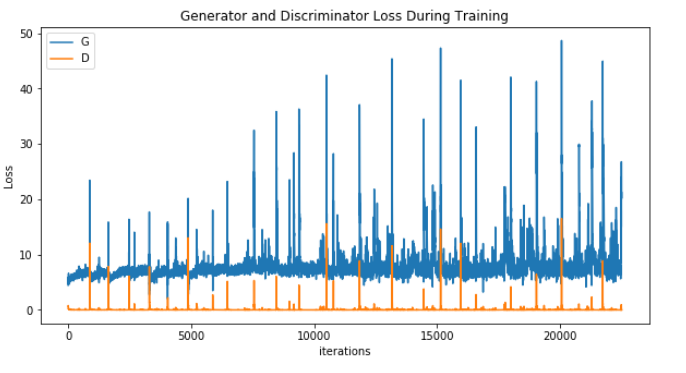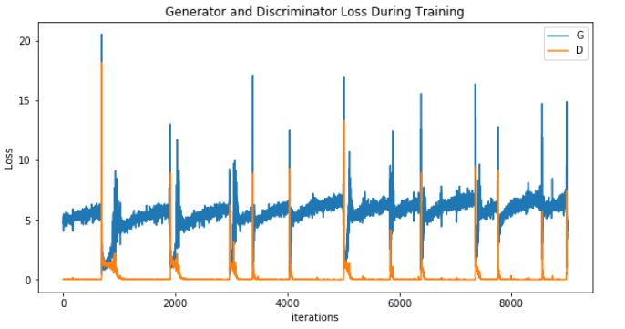 We can see at 305 epochs that the generator loss is higher than the discriminator. There is also an oscillating pattern. This tells me that the generator is struggling to create fake images that are real-looking-enough to fool the discriminator. D(x) has pretty much approached zero from the first few epochs and isn't providing a gradient that the generator can learn from. As a friend of mine told me, the discriminator has a much easier job than the generator; if it is trained faster the game for both will essentially end.