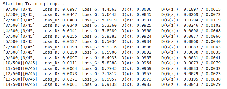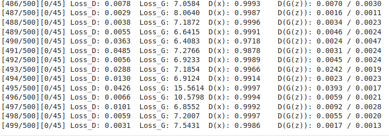 Starting up the training again, to train another 500 epochs, we can see that the discriminator is doing a better job at predicting the real D(x) than the fake D(G(z)). The generator was not able to learn how to generate enough diversity, as well as the discriminator was able to detect its fakes.