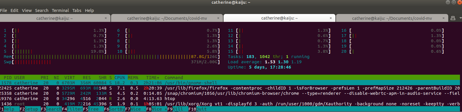 If you're on Ubuntu like me, I'd recommend sudo snap install htop in order to install a handy memory monitor. If you do scratch work in Jupyter like I do, you can see how much Mem and Swp you're consuming in some of these processes. You can also kill a PID if something becomes responsive.