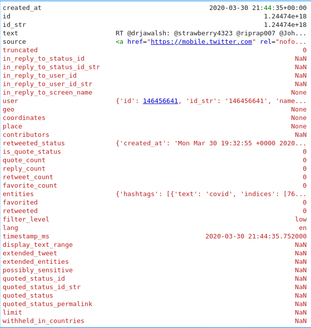 Using tweepy and an individual user account to Twitter, I streamed several million tweets overnight. We end up with a .json file with these fields: