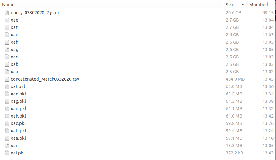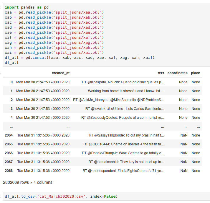 We went from a 20.6 GB json file -> bash generated data files of 15.3 MB (remember the file with only 2069 tweets) to 2.7 GB, each -> pkl files 372 kB to 65 MB -> a final pandas dataframe of 484.9 MB that I can totally work with moving forward. You'll also see that the split of the jsons, preserves the sequence of the files.