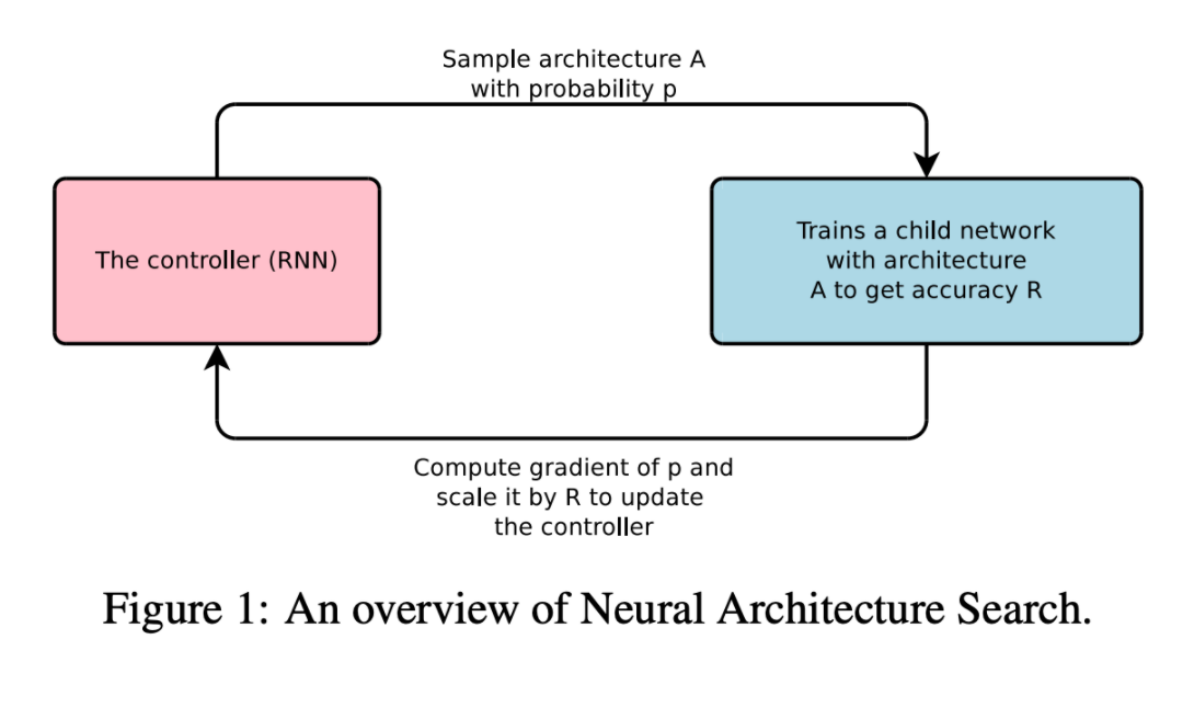 NAS was introduced by Zoph and Le from Google Brain in February 2017 and is a gradient-based method for finding good architectures. It consists of what they call a "Controller" which is a recurrent neural network (RNN) that generates candidate neural network architectures based on a string of hyperparameters. A neural network (the child) is trained using one of the candidate architectures and its validation accuracy on an image classification task (e.g. CIFAR-10) is calculated. Reinforcement learning is used to maximize the expected accuracy R. Gradients are updated for the controller, and it begins again.