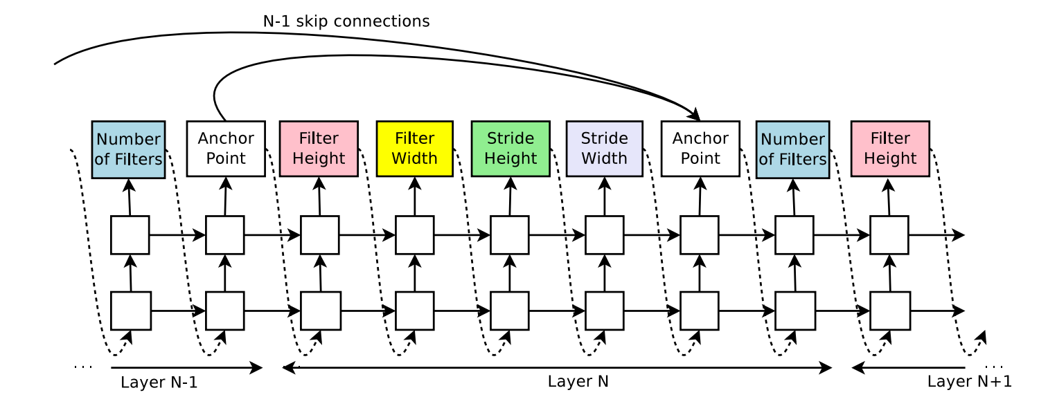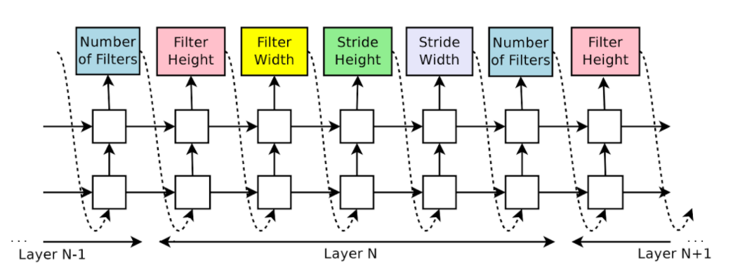 RNNs can be used to generate architectural hyperparameters of neural networks such as the number of filters for each convolutional layer, the filter height, width, stride, etc. Zoph and Le observed that the structure and connectivity of neural networks can be specified by a variable-length (e.g. any length) string, outputted by the RNN much like a string of characters, terms, and values in a one-to-many or many-to-many sequence.