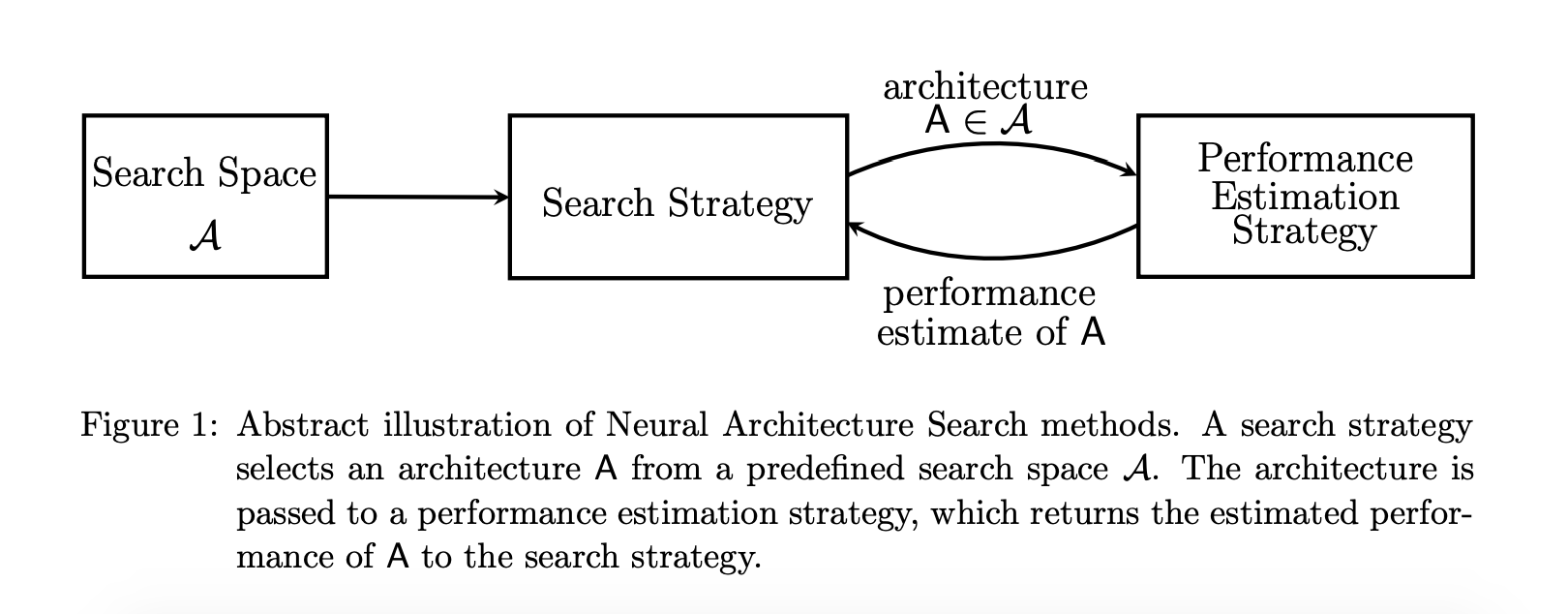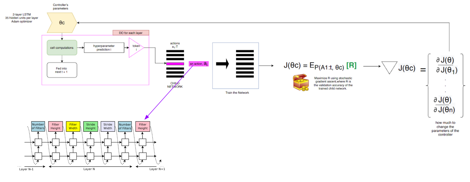 Before digging into the NAS paper, I found a survey paper by Elksen et al. entitled Neural Architecture Search: A Survey. Elksen reviews NAS methods in addition to Zoph & Le's, and presents NAS as a method with three components - 1) the configurations for which a neural network architecture will be searched (Search Space) to generate a candidate architecture, A, followed by 2) a search strategy to optimize the network such as Bayesian optimization or reinforcement learning (RL), and then 3) an estimate, not an exact, measure of the performance of A that can be conducted in a reduced manner such as on a subset of validation data, for a fewer number of training epochs and more, in an effort to minimize GPU training time since the NAS process can take a very long time.
