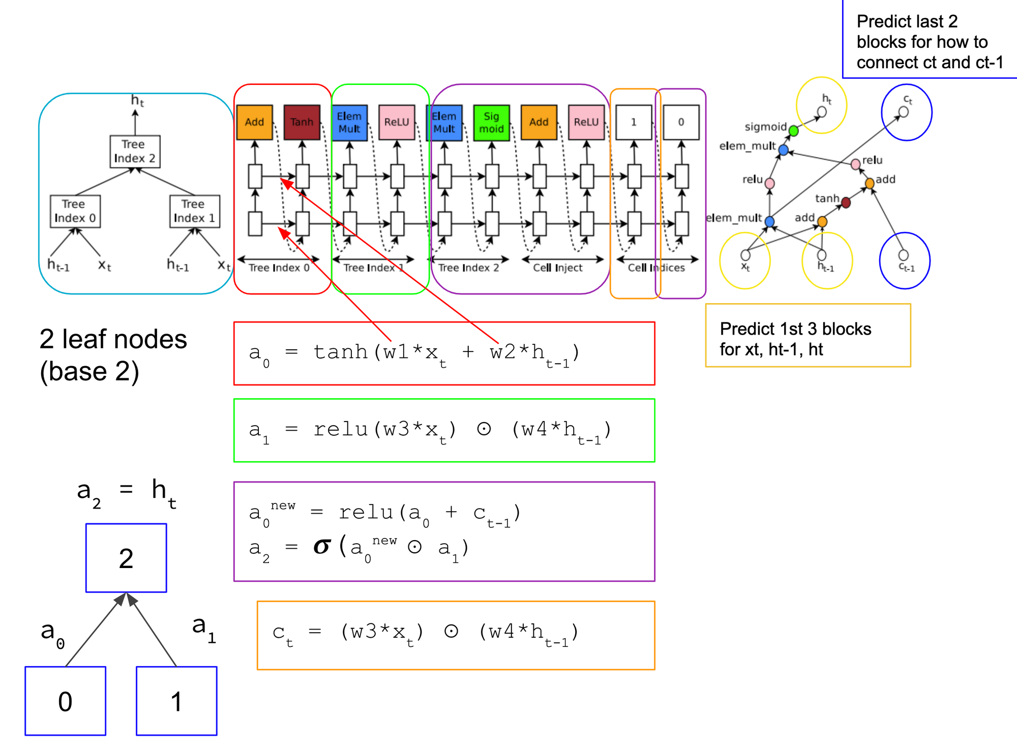 I traced the computation steps in Zoph & Le's figure of "an example of a recurrent cell constructed from a tree that has two leaf nodes (base 2) and one internal node. Left: the tree that defines the computation steps to be predicted by the controller. Center: an example set of predictions made by the controller for each computation step in the tree. Right: the computation graph of the current cell constructed from example predictions of the controller." So, as the caption indicated, you can see that the middle blocks is one of any number of predictions a Controller can make. Each RNN in this example has 2 base leaf nodes indicated by Tree Index 0 and Tree Index 1. Both feed into computing Tree Index 2. In this sample computation, we can see that Index 0 is computed as a function of a relu activation with the previous cell state, c_{t-1}. Index 1 is computed as the element-wise multiplicative function of the current input, x_t and the previous hidden state, h_{t-1}. The Index 2 takes the sigmoid activation of the element-wise multiplicative product of both. Note, all these example formulae are provided in the paper.