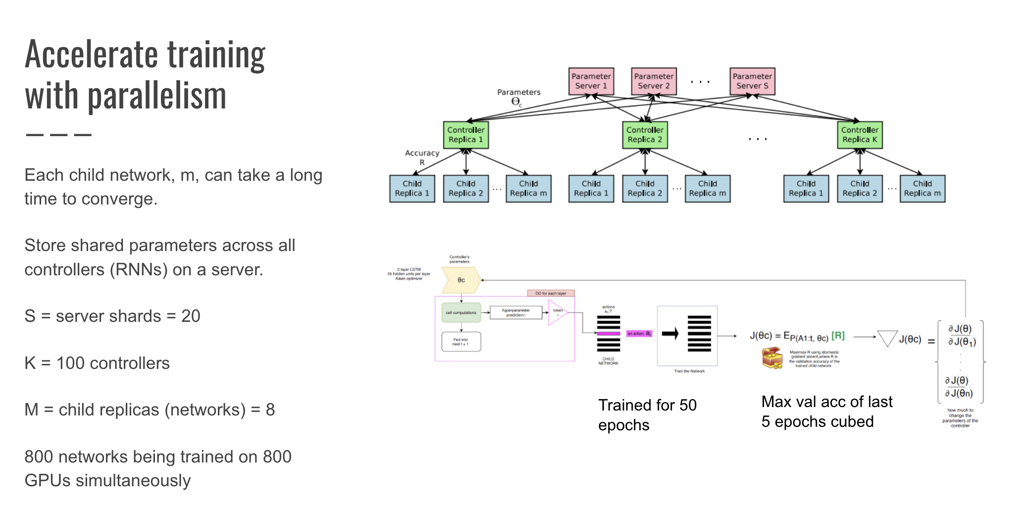 - Shards, S = 20; Controller replicas K = 100, m child replicas = 8, total of 800 networks being trained on 800 GPUs simultaneously