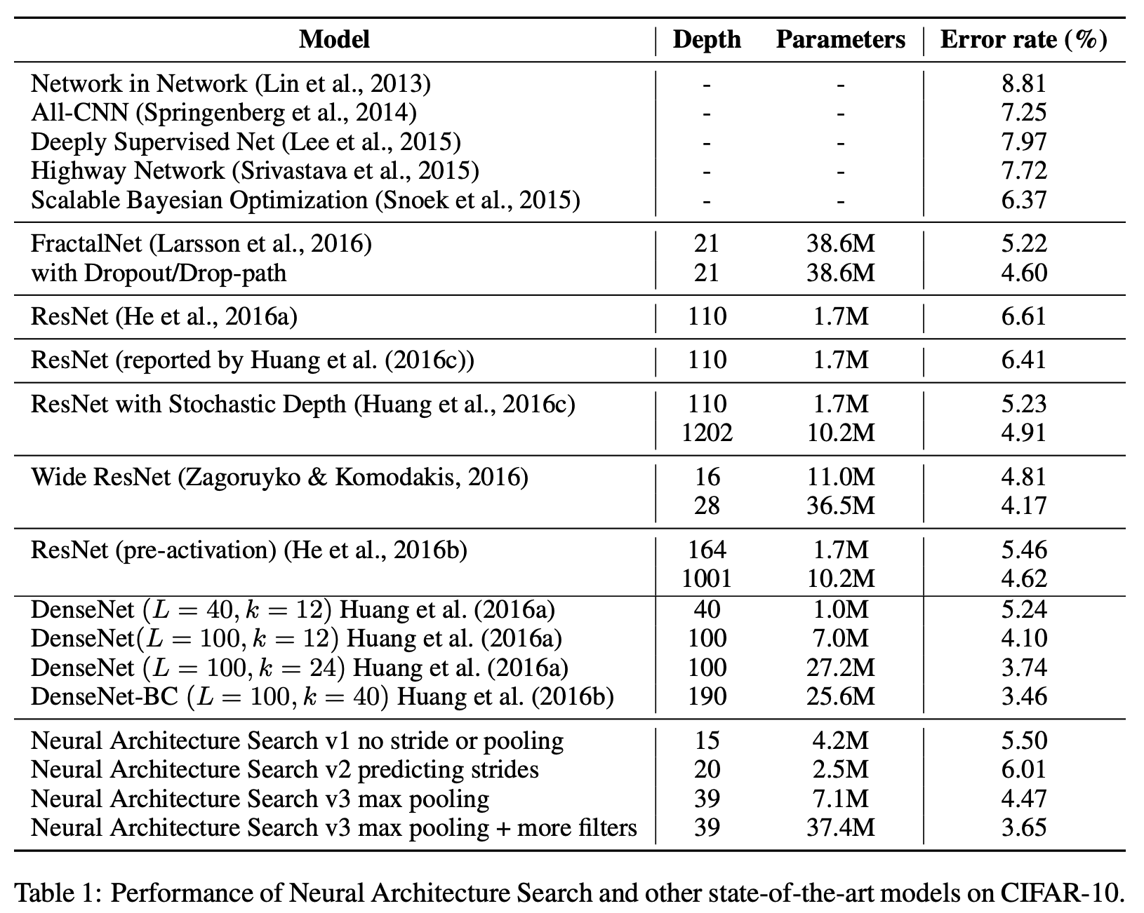 - NAS v1 no stride or pooling, depth 15, 4.2M params, 5.50% error rate