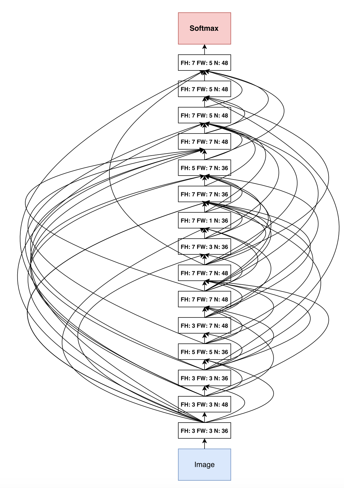 Below is the discovered convolutional architecture by Zoph & Le. Do we see any similarities between it and the higher scoring dense block design above? One thing are the similar "any to any after" skip connections.