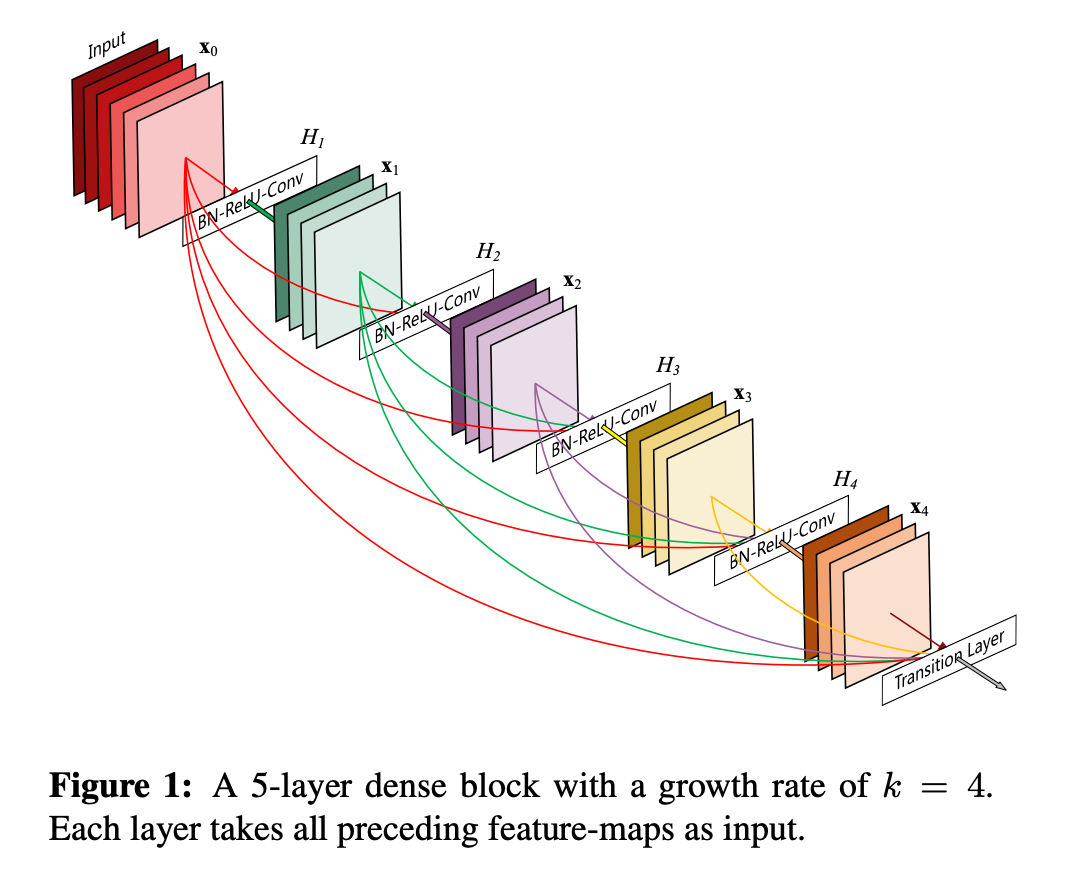 Below is an illustration by Huang et. al of a dense block for DenseNet-BC (k=40). Per Huang et al., Dense blocks, below, use dense connectivity similar to skip connections - direct connections can happen from any layer to all following layers.