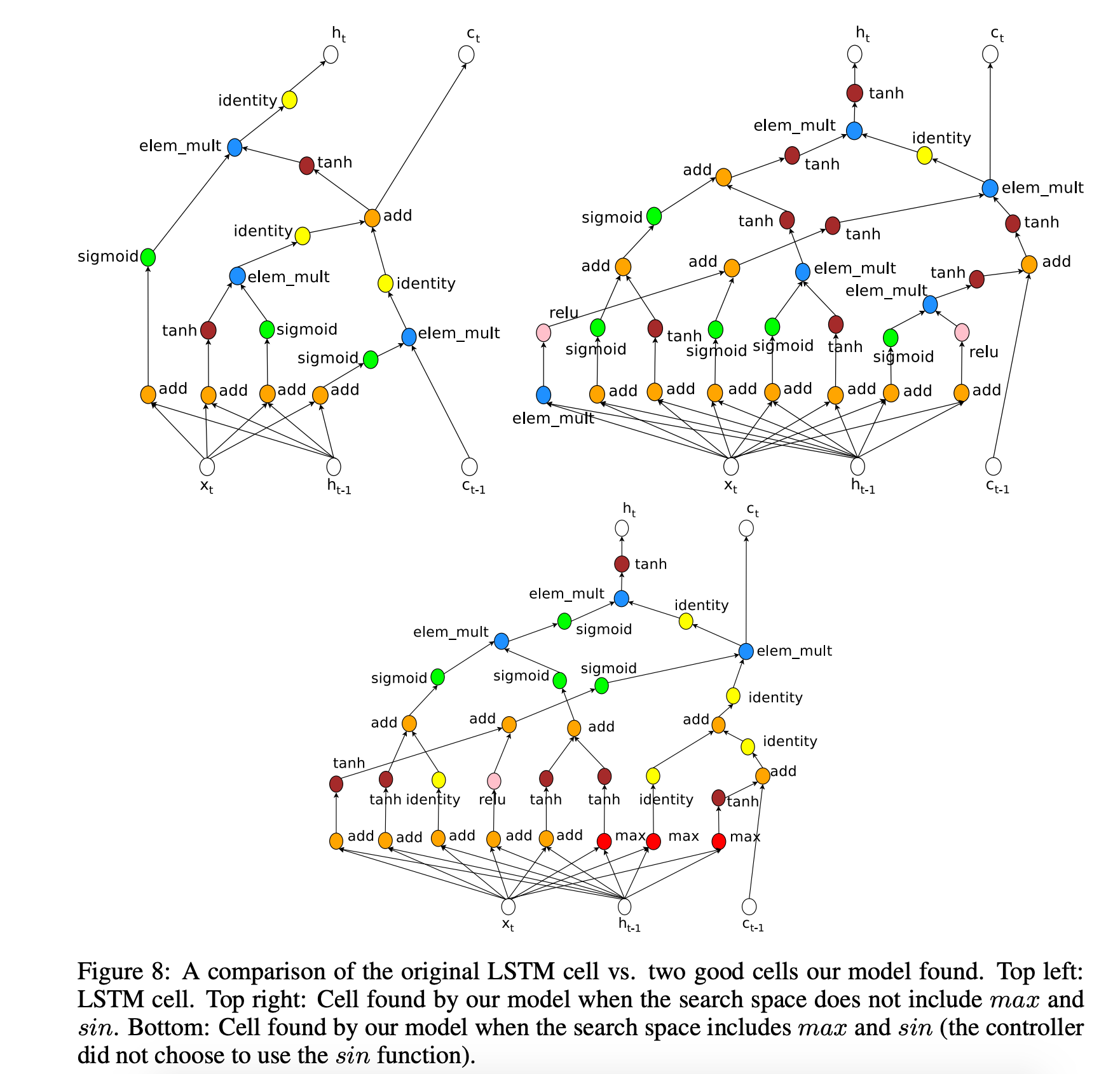 Is there an automatic way to develop these GAN architectures? This is what Neural Architecture Search (NAS) attempts to do. Using NAS, the authors found that it can design several architectures including convolutional neural networks (CNNs) and recurrent neural networks (RNNs) competitive to some of the best performing models on CIFAR-10 and the Penn Treebank, respectively. For example, the best NAS searched architecture was a CNN using max pooling that consisted of 37.4M parameters with a 3.65 error rate on CIFAR-10, compared to DenseNet-BC (Huang et al 2016 at 3.46). The long-short term memory (LSTM) cell found by NAS outperforms other RNNs on the Penn Treebank Task, such as recurrent highway networks by Zilly et al. (66.0 test perplexity) and Inan et al VD-LSTM (68.5 perplexity), with a 62.4 test perplexity.