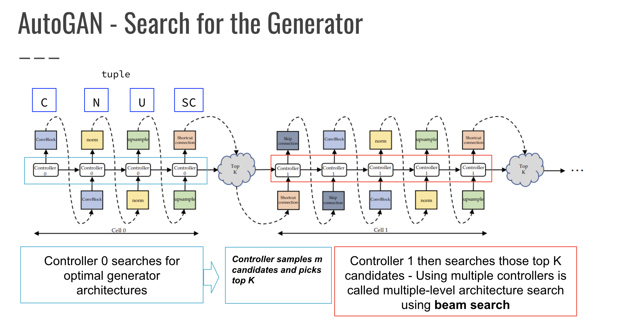 Here, AutoGAN searches for the Generator architecture. A Generator can be composed of many cells. A different Controller is used for the search step of each cell. A search space for a Generator cell consists of a tuple of a convolutional block (C), normalization block (N), upsampling block (U), and shortcut (SC) which is a binary value. Remember, these blocks are similar to "motifs", or design patterns. The Controller searches and then samples the m candidates and picks the top K. Another Controller then searches those top K candidates using something they call a "multi-level architecture search" using beam search: