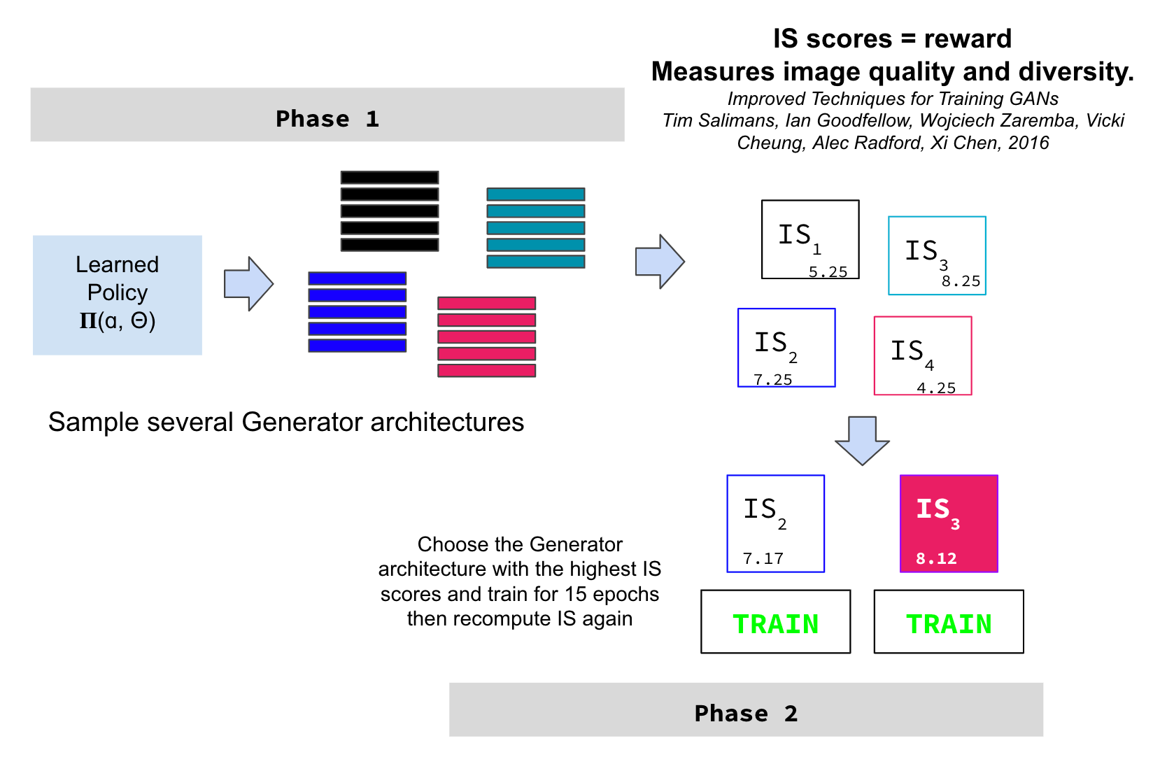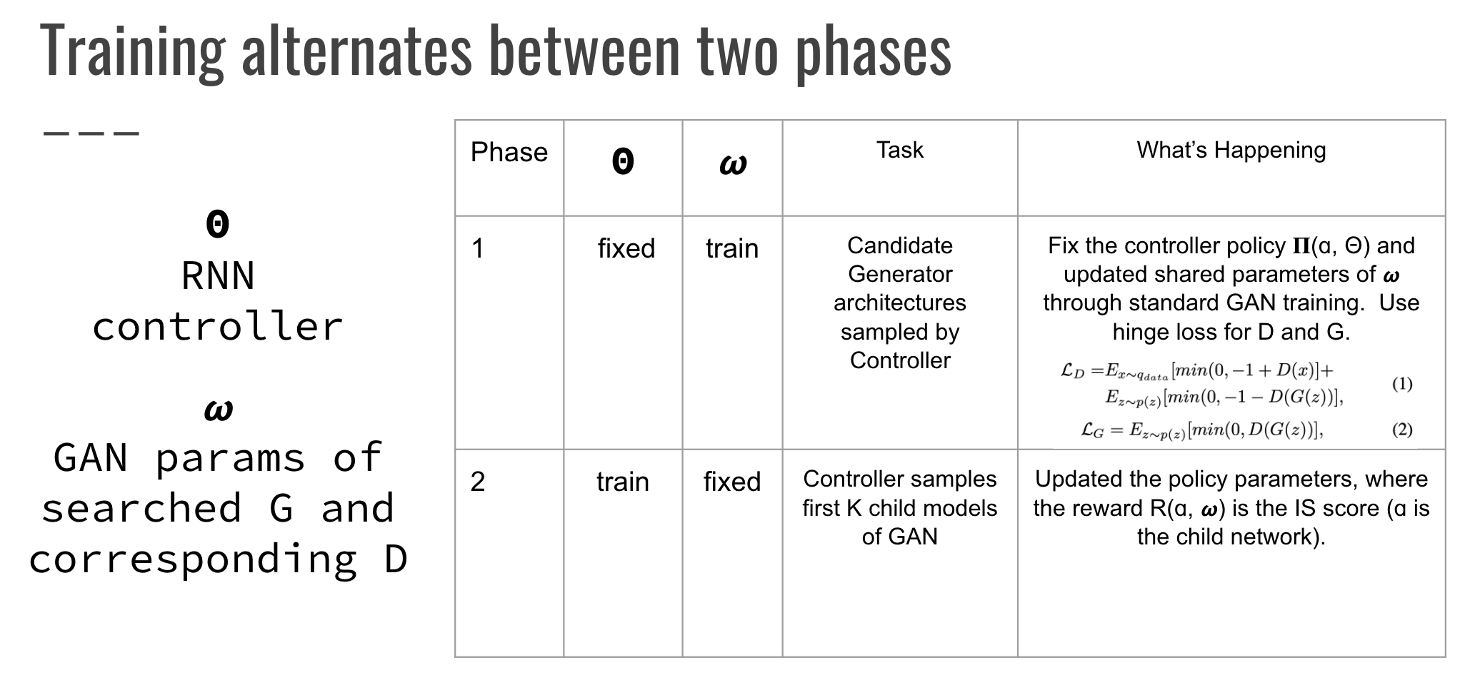 The training alternates between two phases. In Phase 1, the RNN controller parameters are fixed and several Generator architectures are sampled (offered up as candidates) via the learned REINFORCE policy. AutoGAN uses a hinge loss (e.g. SVM loss) to train the Generator and Discriminator. In Phase II, the GAN parameters are fixed and the Controller is updated by scoring each child network (the k best) based on their Inception Score (IS), a measure of quality and diversity for the images generated. Recall, this is similar but varies from NAS's use of validation accuracy.