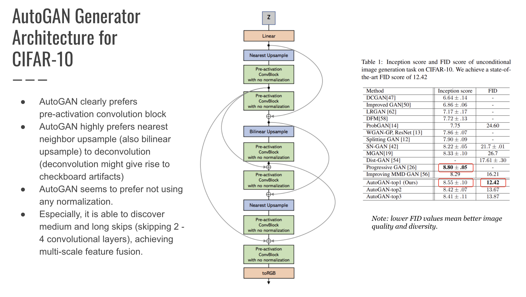 Below is the Generator architecture discovered by AutoGAN, bullets are directly from their paper denoting observations about this architecture - pre-activation convolutional blocks, skip connection discovery, and lack of normalization. On the CIFAR-10 image set, this discovered architecture (AutoGAN-Top1) obtained a FID score of 12.42 and IS of 8.55.