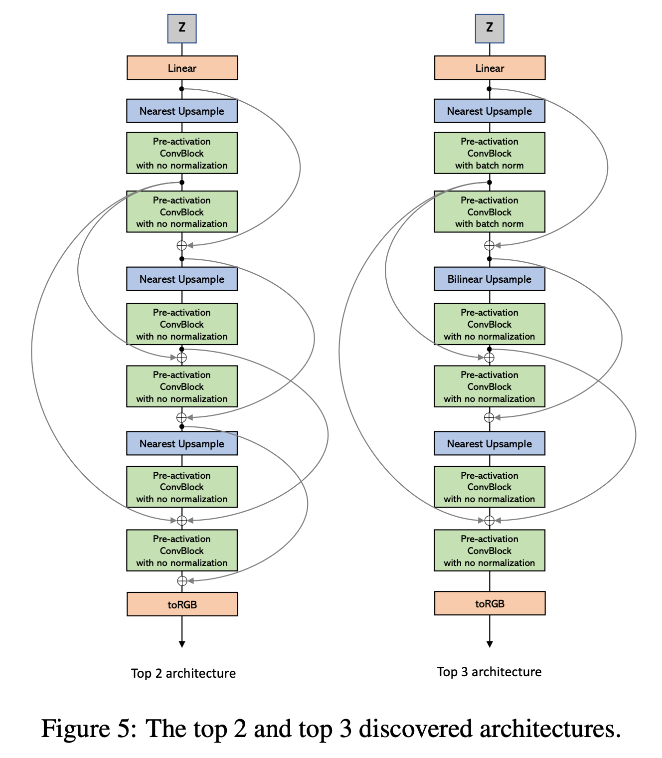 Below are the Top 2 and 3 discovered Generator architectures. Both blocks are similar, but the architectures differ in their number and locations of skip connections.
