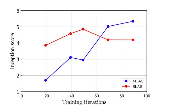 And finally, I had mentioned above how they use something called "multi-level architecture search" (MLAS) as the search strategy - uses multiple controllers to search for different combinations of blocks. They tested MLAS versus SLAS which sweeps the space to find a full CNN at once. SLAS starts off strong with a higher IS but MLAS catches up and beats the IS score. I'm not sure which AutoGAN this is for, since their top 3 yield IS scores above 8.41 +/-.11. They talk about how this decreases training time since SLAS is slow to train, but I suppose I'm not clear about why and how MLAS overtook SLAS in the IS which they didn't cover in the paper.