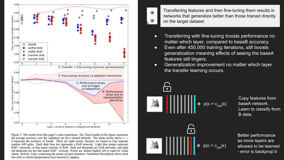 The base case is to compare all experiments against baseB. The top accuracy was 0.625. We can see that in Figure 2 there is interesting middle-layer behavior occurring. Consider layers 1 to 4 are frozen from B data. Layers 5 – 8 are randomly initialized. Similarly, layers 1 to 5 are frozen from B data, and layers 6 – 8 are randomly initialized. They discover that performance drops when they transfer up to layers 4 and 5 because there exists fragile co-adaptation. These are features that interact with each other in complex ways, so complex that they can’t be relearned in upper layers. There is less co-adaptation between layers 6-7 and 7-8, and more in the middle layers. We might also think about this in a different way as pointed out by the authors, that relearning the last two layers as the networks gets closer to the softmax layer isn’t too hard for the optimizer! When turning our attention to the fine-tuning self BnB+, they show that fine-tuning prevents the performance drop observed in selfer BnB - allowing the later layers to relearn and update gradients is equivalent performance to the base case. But the worst performance occurs with transfer AnB. In the AnB experiments, particularly layers 4 - 7 show significant drop in performance, meaning that two things are happening according to Yoskin et al: 1) They lost co-adaptation as shown earlier, and 2) The drop is happening when there are fewer and fewer features to train on.