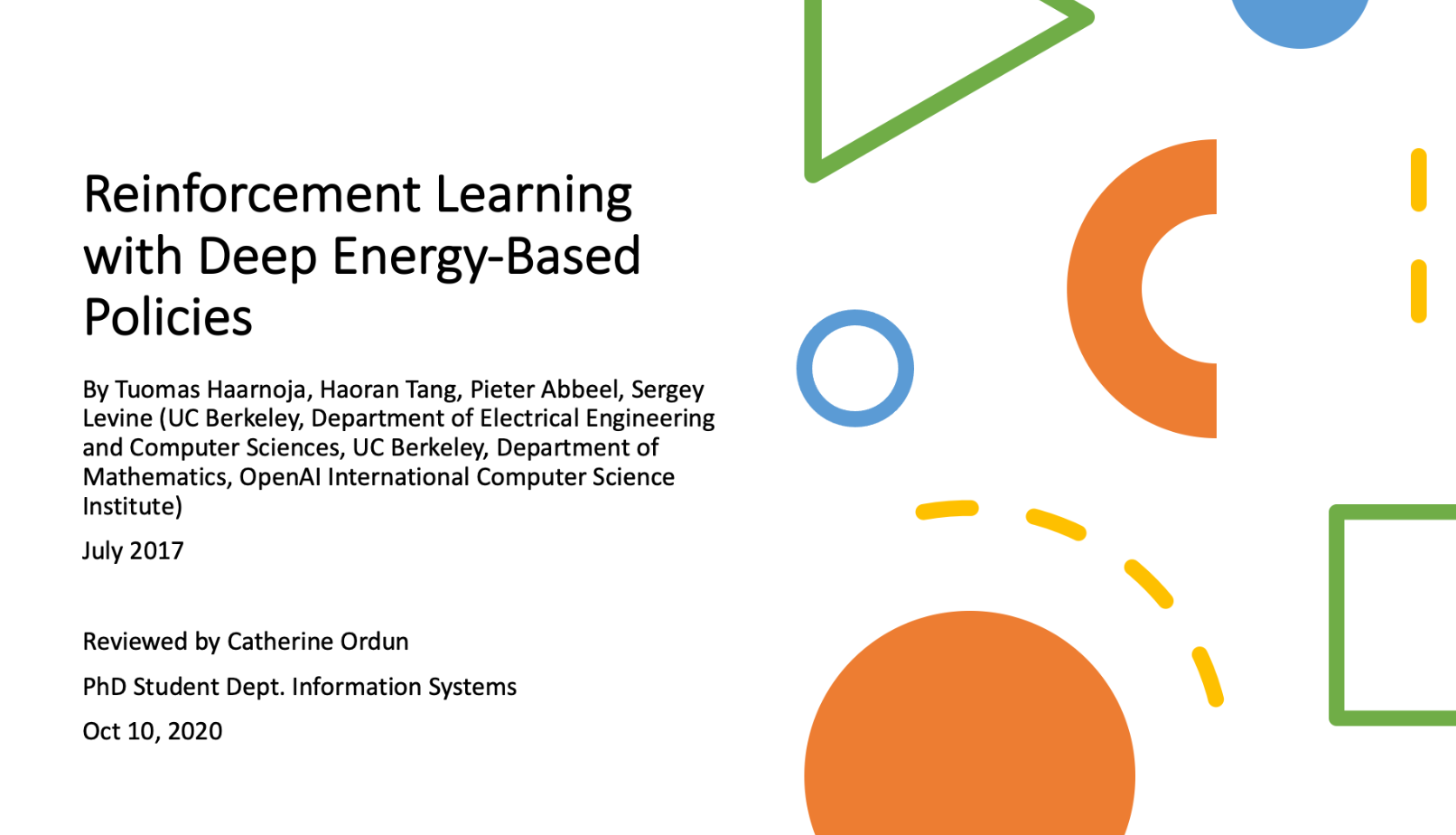 It's been a very long time since I've last posted, and at last I've come up for some air after writing a few papers and a lot of code. One thing I've come to appreciate in my PhD studies is the frequent requirement to review and present on a paper. These are usually key works in AI that I will later need to understand cold, for my comprehensive exams. In order to keep that spirit alive and also share what I've learned, I'll start to publish my reviews I've submitted to class here on my blog. I'll also open a link on my Google Drive for you to download the slides I created to present in class. The first one was actually AutoGAN, the post that's been lingering on my site forever. The second one is this - a paper review of a very important paper by Tuomas et al. Haarnoja, Tuomas, et al. "Reinforcement learning with deep energy-based policies." arXiv preprint arXiv:1702.08165 (2017). Detailed videos and explanation here at https://bair.berkeley.edu/blog/2017/10/06/soft-q-learning/