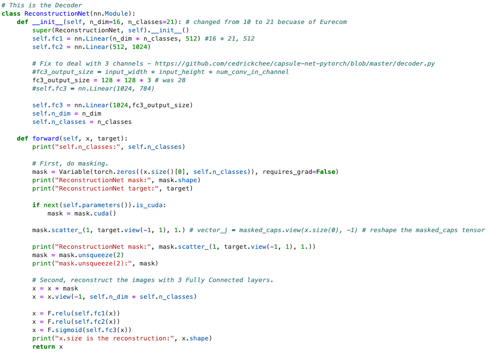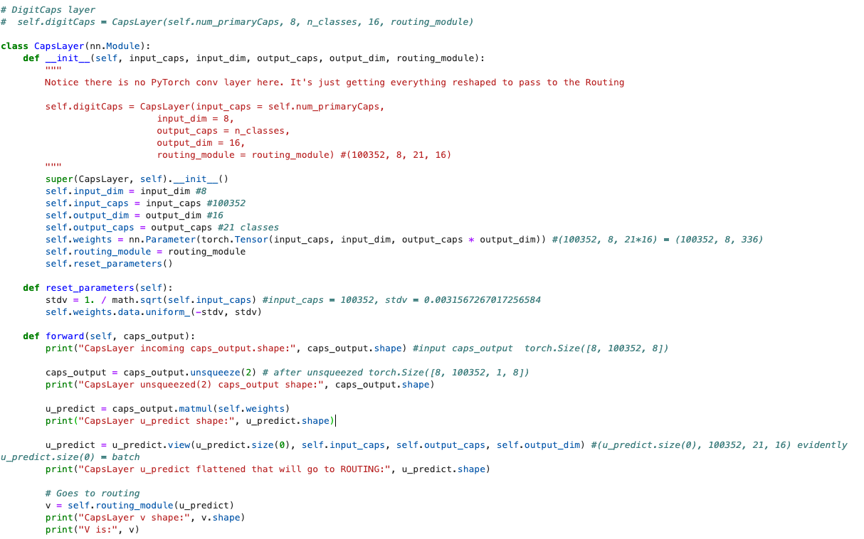 Third, make your own comments and print out shapes of tensors. I see this as the process of accepting that this is the code you're going to modify - so, make it your own. Because there's so much to keep track of, it helps to write comments about how the code works. In the below figure, I made a note that this CapsLayer has no convolutional layers, it's just a sequence of reshaping and routing to other functions - in this case, passing a tensor to another function that handles the "routing by agreement" algorithm. You'll also see I print out a lot of shapes via .shape. What ends up happening is that if I stop the process in terminal, I can kind of figure out what tensor caused which problem like matmul errors, tensor type errors Expected object of scalar type Long but got scalar type Float, and errors like this RuntimeError: Expected 4-dimensional input for 4-dimensional weight [64, 3, 4, 4], but got 2-dimensional input of size [1, 196610] instead.