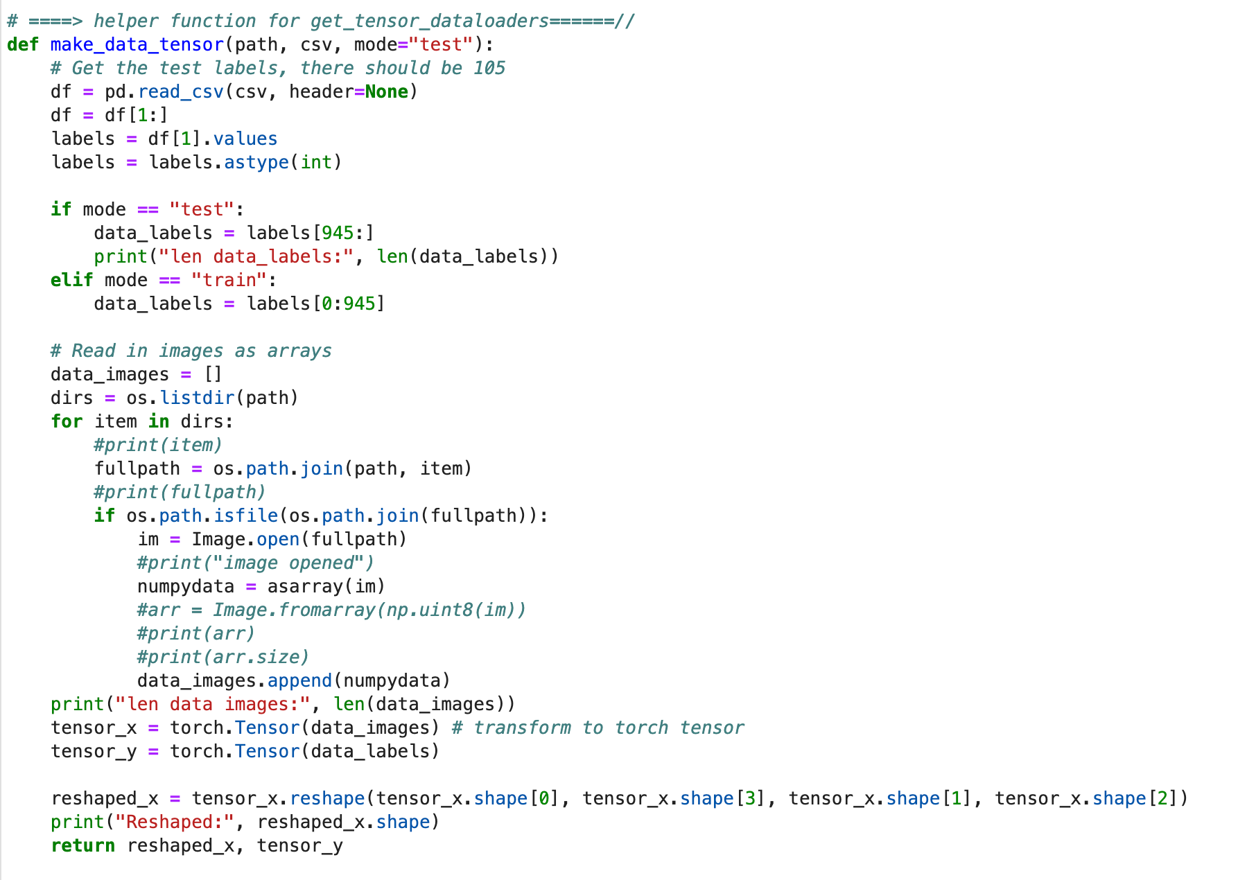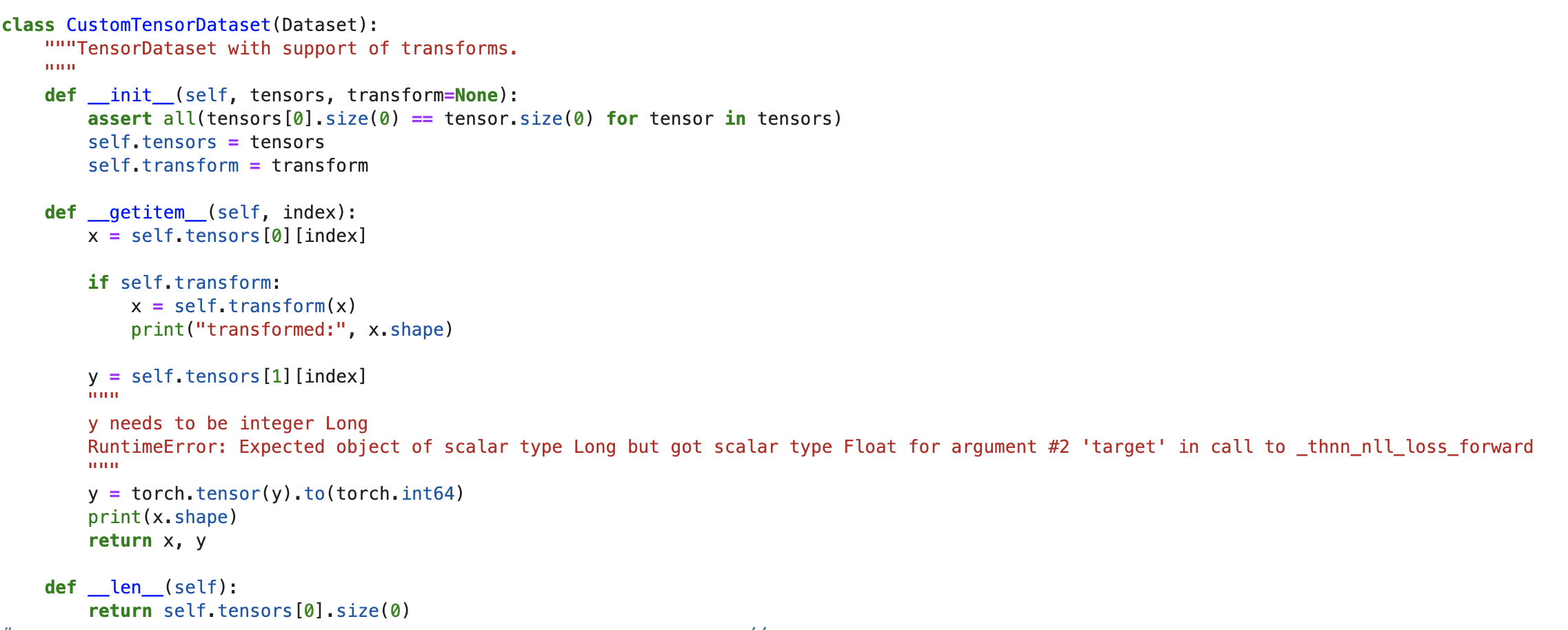 return len(self.files)3. You may need to write a custom dataloader for your own custom dataset that will mesh with their dataloader. This isn't a trivial task and I've found myself, like I said taking a few days to figure this out. I usually end up modifying their dataloader.py in a way that will get my image, label, and transformations for my dataset. For example, in the Counterfactual GAN implementation, after the counterfactual image is generated, you can train an invariant classifier. But this calls for a new data structure than what I originally used - which is a TensorDataset. This required me to write additional helper functions to supply the train and test datasets as tensors.
