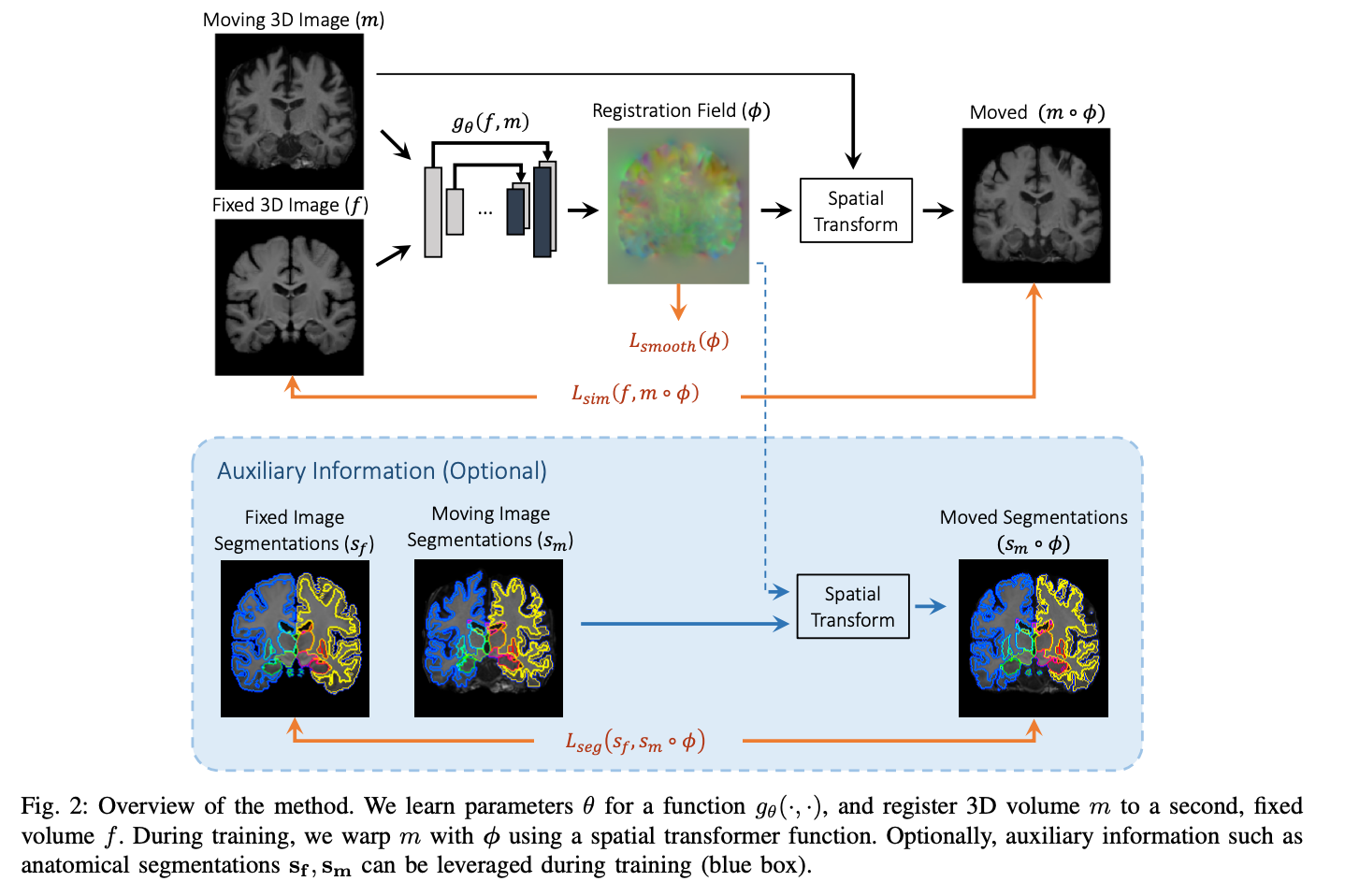 Many deep learning approaches like Voxelmorph (Balakrishnan et al), integrate a spatial transformation network (STN) (Jaderberg et al). The goal of the STN is to predict transformation parameters by a localization network to create a sampling grid. This grid consists of coordinates used to guide how the input feature map is sampled. An affine transformation can then be applied to the sampled vector to generate the registered output. The localization network can be any neural network like a CNN. A limited number of works explore the concurrent application of image registration with image-to-image translation.