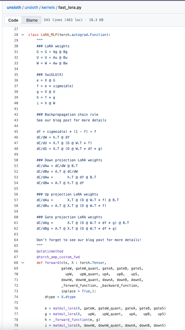 Now about that speed-up in FT’ing with Unsloth. If you take a look at "https://github.com/unslothai/unsloth/blob/main/unsloth/kernels/fast_lora.py", you’ll see the secret sauce. Basically, it manually derives (chain rule anyone?) backprop and rewrites all Pytorch modules into Triton kernels. This makes it reduce memory usage and make FT faster. For anyone who’s trained models in Pytorch, you’ll know to use ‘autograd’. It’s not very computationally efficient for repeatingn operations like attention. So, in the code above, you’ll see handwritten GPU kernels and manual derivation to be calculated on the fly.