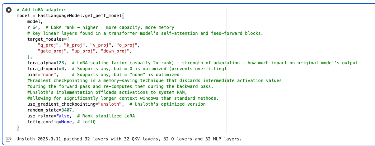 Unsloth uses Low-Rank Adaptation (LoRA), which is a popular choice for fine-tuning and has been around for a few years now. LoRA essentially adds small, trainable “adapter” matrices to existing layers in a transformer. Lots of industry frameworks use this like NVIDIA’s Nemo. You’ll see this in the code like this for Unsloth, in their Phi-3B model, where the below are targeted for LoRA and are a combo of attention and feed-forward layers.