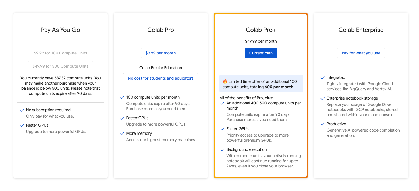 I’ve been spoiled to have GPU servers at my convenience both during UMBC and at Booz. But, now, since I’m running this on my personal machine, I decided to purchase a Google Colab Pro+ subscription. I kind of feel like an ad, but now with Colab I can summon an A100 or better - whenever they’re available - at a flat, monthly rate at ~$50. I was going to use Lambda Cloud, but I thought for basic learning, this was easy enough.