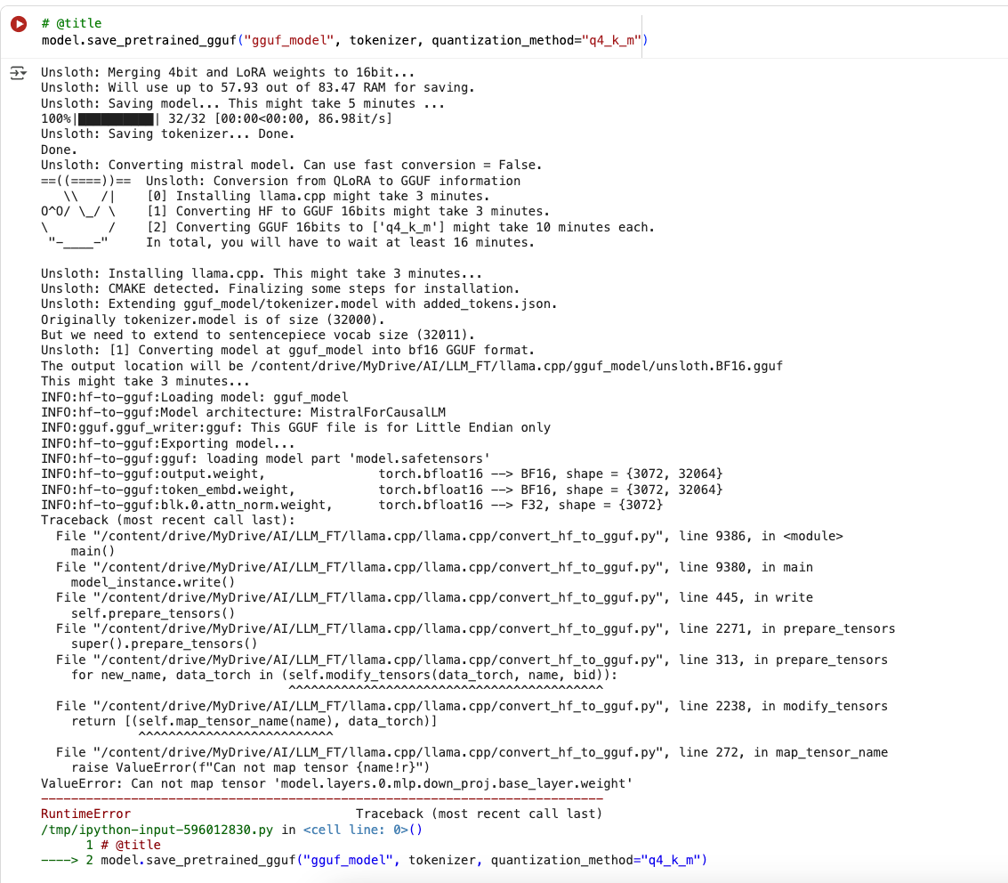 The entire tutorial - all the AI stuff - was easy to follow. Actually, it was all the errors I encountered converting the Unsloth LoRA into a GGUF format that could be read by Llama-cpp. That was more or less the problematic part, as Unsloth’s quantization failed. That’s too bad since I was going to run it locally on my machine. But I think there are manual ways of conversion around this.